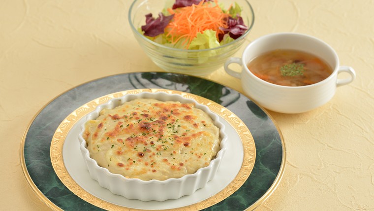きりたんぽ鍋の食材を使用し、和風ホワイトソースをかけて焼き上げました。