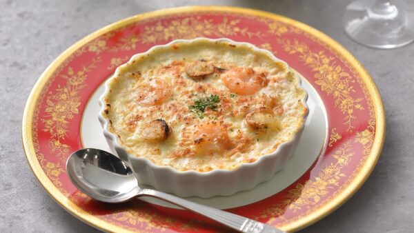 ぷりぷりの海老とホタテを濃厚なソースとともに香ばしく焼き上げた、今の季節にぴったりの一品。