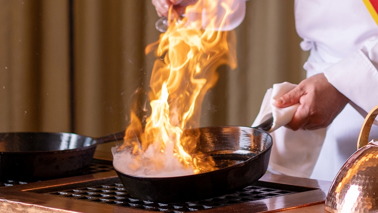 シェフによるフランベサービス≪牛ロース肉のステーキ≫