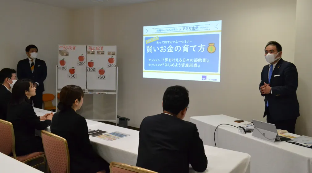 アクサ生命保険株式会社 秋田支社 営業所長の大髙様より、「知って得するマネーセミナー 賢いお金の育て方」というテーマのもとセミナーを開催いたしました。