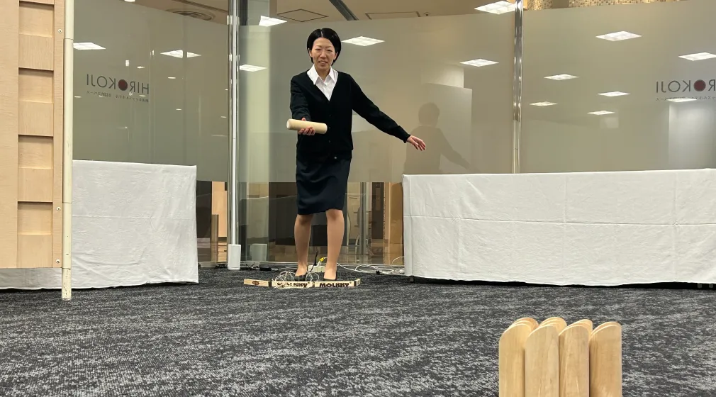 社員が気軽に運動する機会を提供するため、モルックを取り入れました。簡単なルールと社内の空いているスペースで手軽にできることもポイントのひとつ。